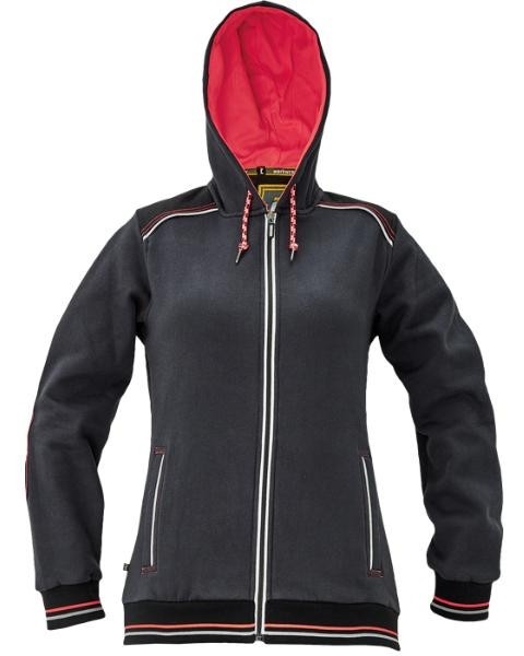 Popis: dámská celopropínací mikina s kapucí z počesaného směsového úpletu bavlny a polyesteru; zesílená oblast ramen a loktů; reflexní paspulka lemující sedlo a lištové kapsy; dvojitá kapuce s kontrastním hi-vis úpletem v barvě zipu a dekorativního prošití; pružné náplety na rukávech a spodním obvodu