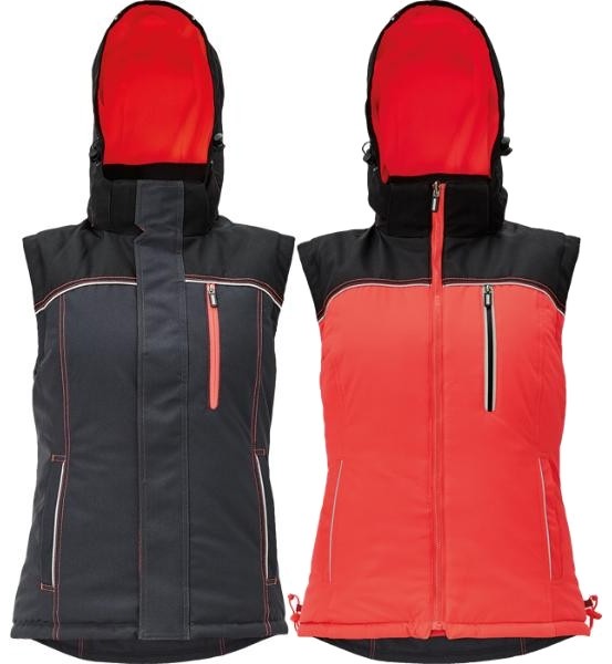 Popis: dámská oboustranná zateplená vesta s odnímatelnou kapucí vhodnou pro obě verze nošení vesty; jedna strana v hi-vis provedení; zesílená oblast ramen; náprsní kapsa na zip a 2 postranní lištové kapsy; lemování sedla a kapes reflexní paspulkou; dvojitá kapuce s kontrastním hi-vis úpletem v barvě dekorativního kontrastního prošití; nastavitelná šířka spodního obvodu a obvod kapuce