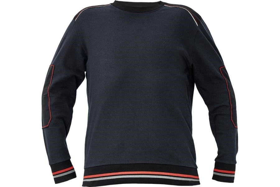 Popis: pánská mikina s kulatým průkrčníkem, z počesaného výplňku směsi bavlny a polyesteru; sedlo v kontrastní černé barvě lemované reflexní paspulkou; zesílená oblast loktů; kontrastní proužky v nápletech; na rukávech a spodním lemu; dekorativní prošití v hi-vis barvě