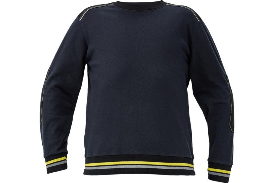 Popis: pánská mikina s kulatým průkrčníkem, z počesaného výplňku směsi bavlny a polyesteru; sedlo v kontrastní černé barvě lemované reflexní paspulkou; zesílená oblast loktů; kontrastní proužky v nápletech; na rukávech a spodním lemu; dekorativní prošití v hi-vis barvě