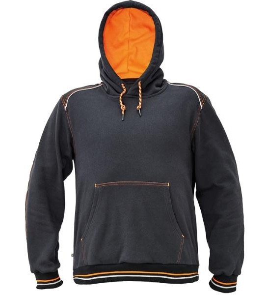 Popis: pánská mikina s kapucí a klokaní kapsou ze směsového počesaného úpletu bavlny a polyesteru; zesílená oblast ramen a loktů; reflexní paspulka lemující sedlo a lištové kapsy; dvojitá kapuce; dekorativní prošití; pružné náplety na rukávech a spodním obvodu