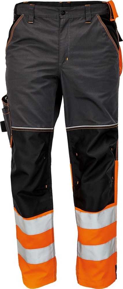 Popis: pánské pracovní kalhoty v kombinaci s hi-vis materiálem ve spodní části nohavic a 2 našitými reflexními pruhy • elastický pas • 2 postranními kapsy • 1 multifunkční kapsa na nohavici • D kroužek pro přichycení identifikační karty • 2 nakládané zadní kapsy s patkou • poutko na nářadí v kontrastní barvě • zesílená oblast kolen s možností vkládání kolenních výztuh • záložka na nohavici umožňující prodloužení délky až o 5 cm • zesílená zadní strana spodku nohavice • dekorativní prošití a kontrastní prvky v hi-vis barvě