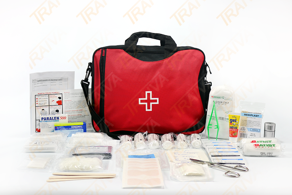 Technický popisBrašna první pomoci s mnoha kapsami. Je lehká, funkční a vyrobena z materiálu, který nepromokne.Přední kapsa je na zip, součástí je odnímatelný popruh přes rameno. Materiál: 600 D polyester/PVCSeznam zdravotnického materiálu: 1 x Antimetil / balení (10 tablet) 1 x Alpa gel 20 ml 5 x Desinfekční ubrousek / 2 ks 2 x Kompres gáza sterilní 7,5 x 7,5 cm / 2 ks 2 x Kompres gáza sterilní 5 x 5 cm / 2 ks 2 x Obvaz sterilní 8 cm x 5 m 3 x Obvaz hotový s 1 polštářkem 3 x Obvaz hotový s 2 polštářky 2 x Obinadlo pružné nesterilní 1 x Vata obvazová, skládaná 50 g 1 x Vata buničitá, přířezy 5 x 4 cm / 10 ks 2 x Náplast – rychloobvaz 6 cm x 1 m 1 x Náplast s polštářkem 8 x 4 cm / 6 ks 1 x Motýlkové náplasti 34 x 58 mm / 10 ks 1 x Mastný tyl sterilní 10 x 10 cm / 5 ks 1 x Krycí fólie – rouška 20 x 20 cm 1 x Izotermická fólie 1 x Náplast na cívce 2,5 cm x 5 m 1 x Škrtidlo pryžové 2 x Trojcípý šátek 1 x Chirurgické rukavice 1 x Nůžky s kulatými hroty 1 x Pinzeta plastová 3 x Lopatka dřevěná 1 x Karta první pomoci