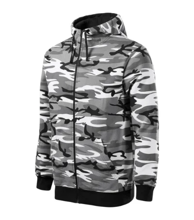 rovný střih s bočními švy, celopropínací reverzní spirálový zip, kapuce s podšívkou, na stažení šňůrkou, vnitřní část průkrčníku začištěna páskou, nakládané kapsy ve stylu klokanky, dolní lem a manžety rukávů z žebrového úpletu 2:2 s 5 % elastanu, kontrastní prvky, vnitřní strana počesaná