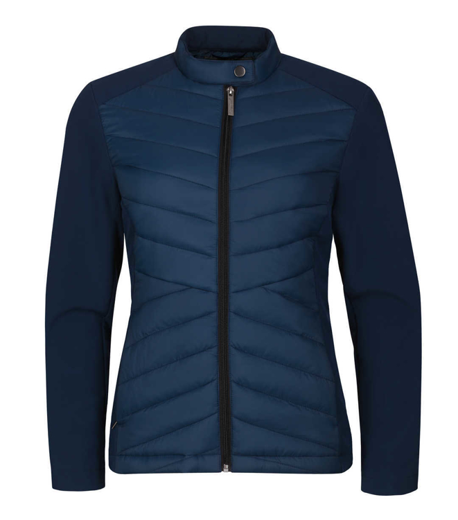 kombinace prošívaného a softshellového materiálu, střih tvarovaný bočními díly, stojáček na druk, celopropínací spirálový zip, boční kapsy se spirálovým zipem, vnitřní náprsní kapsa na zip, vstup pro branding v podšívce zadního dílu