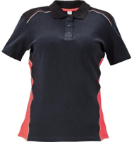 střih s bočními švy, límeček a lemy rukávů z žebrového úpletu 1:1, spodní část límečku a lemy rukávů s kontrastními pruhy, léga s 2 knoflíčky v barvě materiálu, rozparky v bočních švech a spodní léga s kontrastní páskou, vnitřní průkrčník začištěn kontrastní páskou, zpevnění ramenních švů páskou