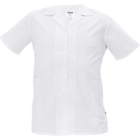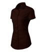 jemný strečový materiál, projmutý střih s bočními švy, dvojité sedlo na zadním dílu, pasové a prsní záševky, dvoudílný košilový límec, přední kraje začištěny légou, perleťové knoflíčky v barvě materiálu (1 náhradní navíc), tvarovaný dolní kraj