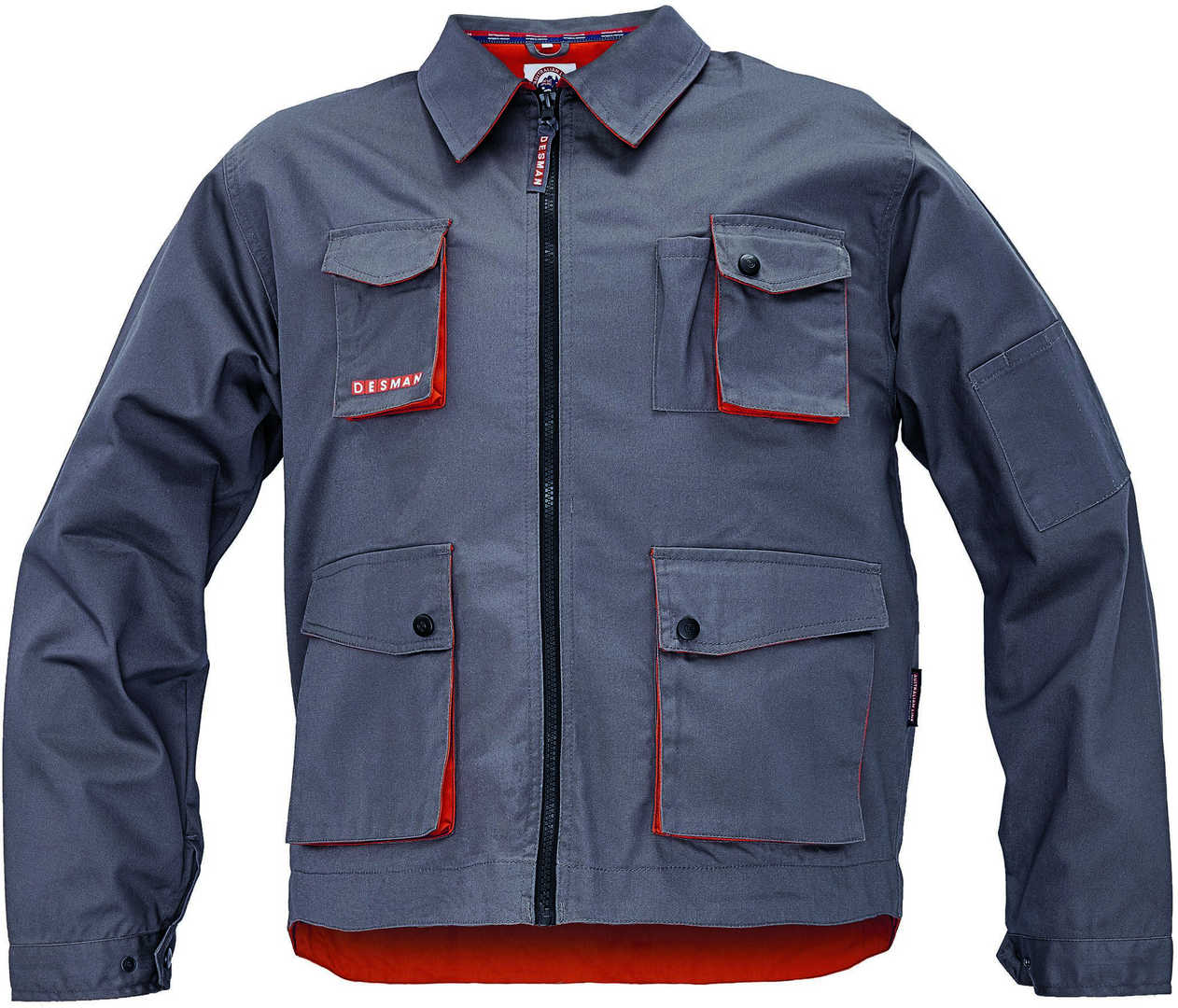 pracovní bunda se zapínáním na zip; 2 velké přední kapsy se zapínáním na druky; 2 náprsní kapsy; nastavitelná šíře rukávů pomocí druků.
