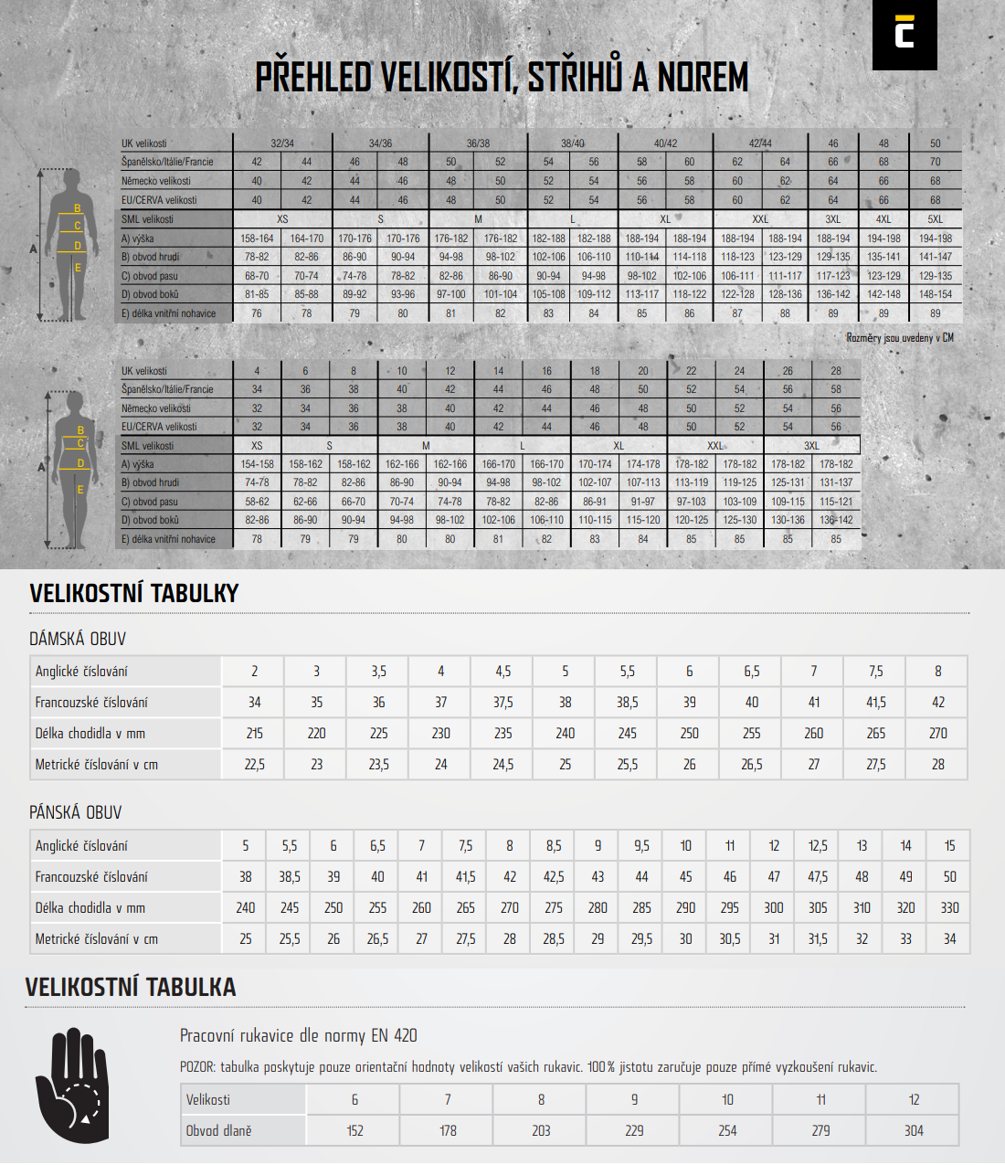 Tabulky velikostí ochranných pracovních oděvů, obuvi a rukavic.