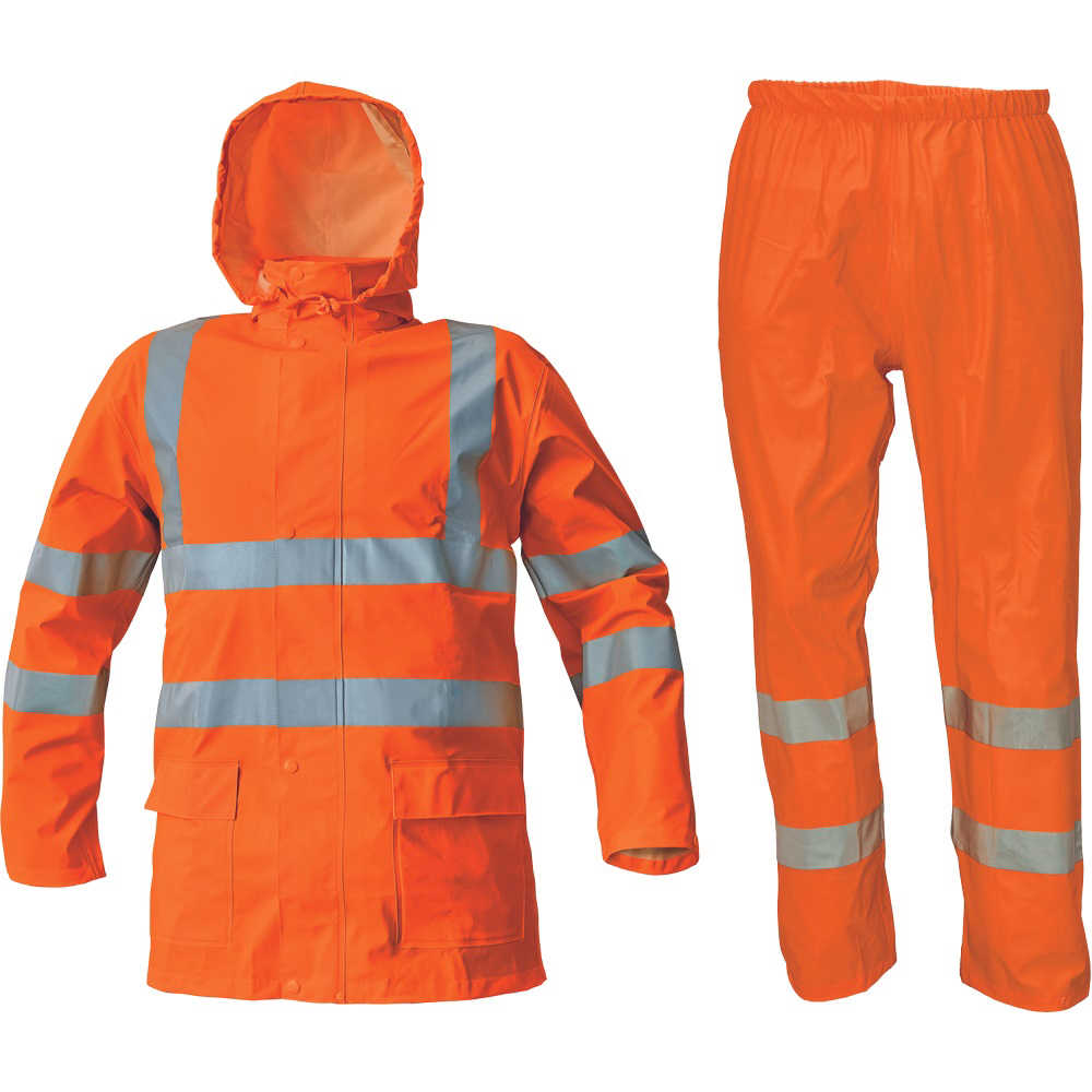• nepromokavý a větruodolný komplet bundy a kalhot • ¾ plášť s kapucí v límci • kalhoty s gumou v pase • reflexní pruhy bundy po obvodu pasu, boků, rukávů a přes ramena • reflexní pruhy kalhot po obvodu spodních nohavic • dvě přední kapsy bundy kryté légami • spodní lem rukávů lze upravit drukem • HI-VIS provedení pouze ve žluté a oranžové barvě