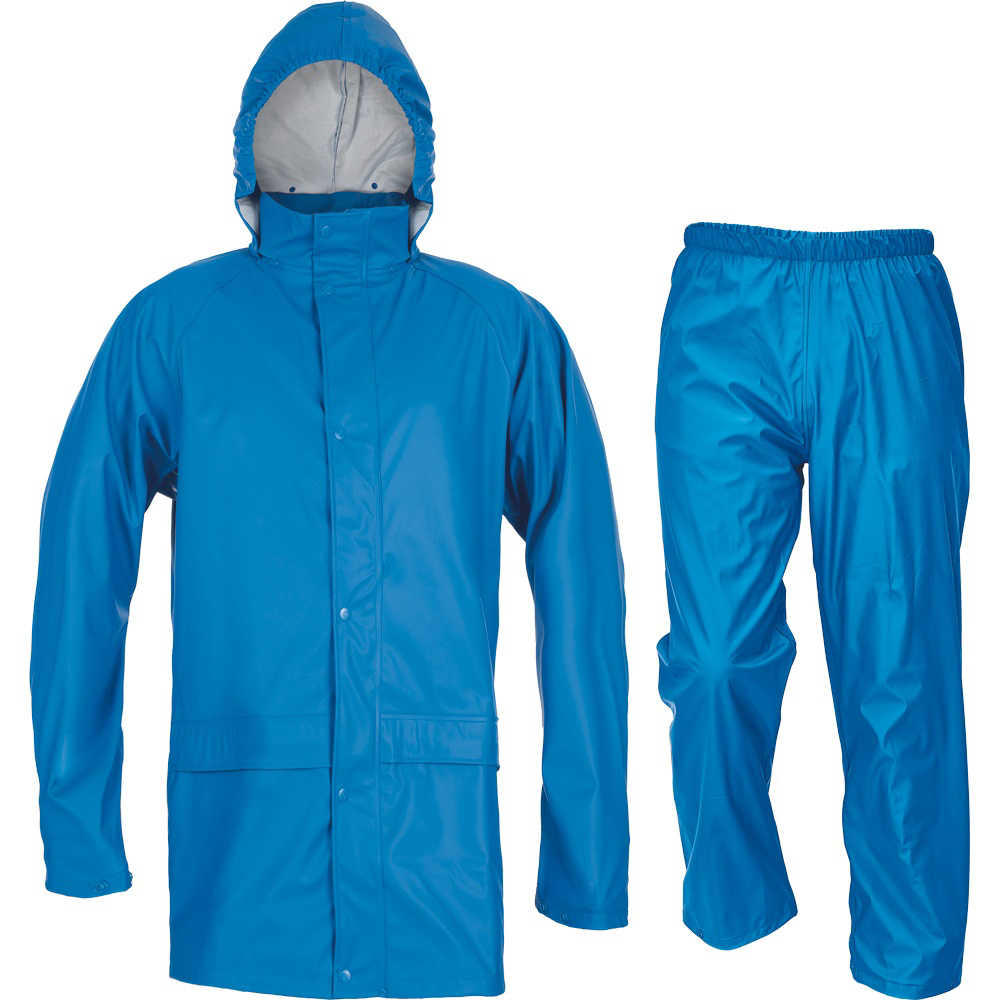 • nepromokavý a větruodolný komplet bundy a kalhot • ¾ plášť s kapucí v límci • kalhoty s gumou v pase •
