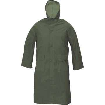 voděodolný ¾ plášť s kapucí, prodloužená délka; všechny spojovací švy jsou zatavené; materiál s nánosem PVC; dvě přední kapsy kryté légami proti průniku vody; vnitřní manžeta na gumu; ventilace na zádech a v podpaží.