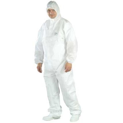 jednorázová ochranná kombinéza s kapucí a zapínáním na zip.