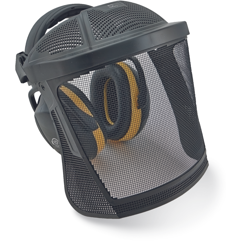 Kombinace náhlavního systému Hellberg s drátěným obličejovým štítem z nerezové oceli a sluchátky ED 2H Ear Defender. Maximální komfort a ochrana pro uživatele, kteří nepotřebují zároveň ochranu hlavy. Sluchátka splňují normu EN 352-1: 2002.