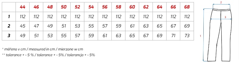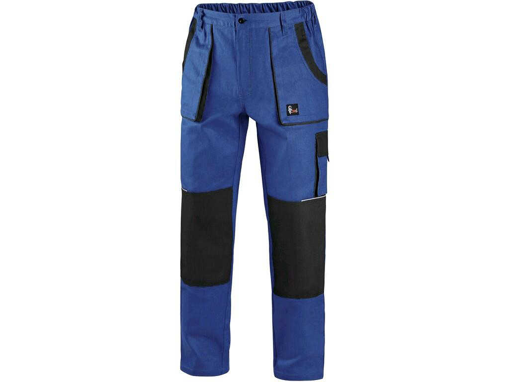 Pánské montérkové kalhoty, pas s poutky na opasek, vzadu do gumy, přední kapsy, boční kapsa na svinovací / skládací metr, boční kapsa na mobil / peněženku, zdvojená kolena, zadní kapsa s klopou, reflexní doplňky.