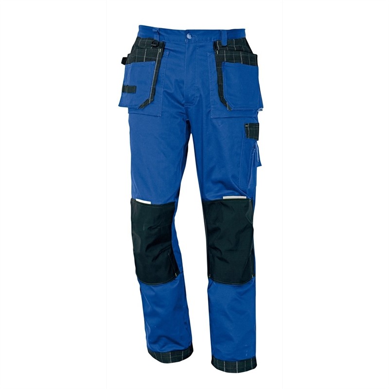 Popis: montérkové kalhoty pohodlného střihu z příjemného strečového materiálu • kárované a signální žluté doplňky • celokovový zip a druky • zesílená zdvojená kolena pro vložení nákoleníků • 2 do kapes zasunovatelné nebo volně visící případné kapsy – hřebíčenky
