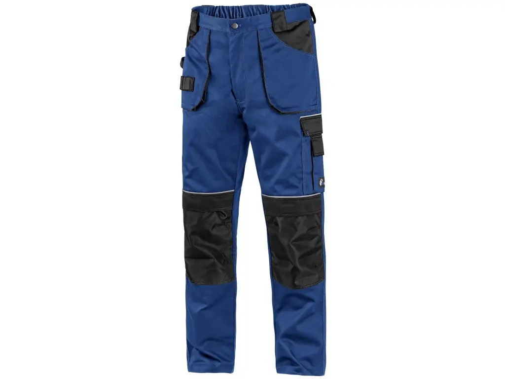 Pánské montérkové kalhoty, pas s poutky na opasek, vzadu do gumy, přední kapsy s poutky na nářadí, multifunkční kapsy na obou stranách, kolena zesílena 600D polyesterem s možností vložení kolenních výztuh, dvě zadní kapsy, jedna na suchý zip, reflexní doplňky.