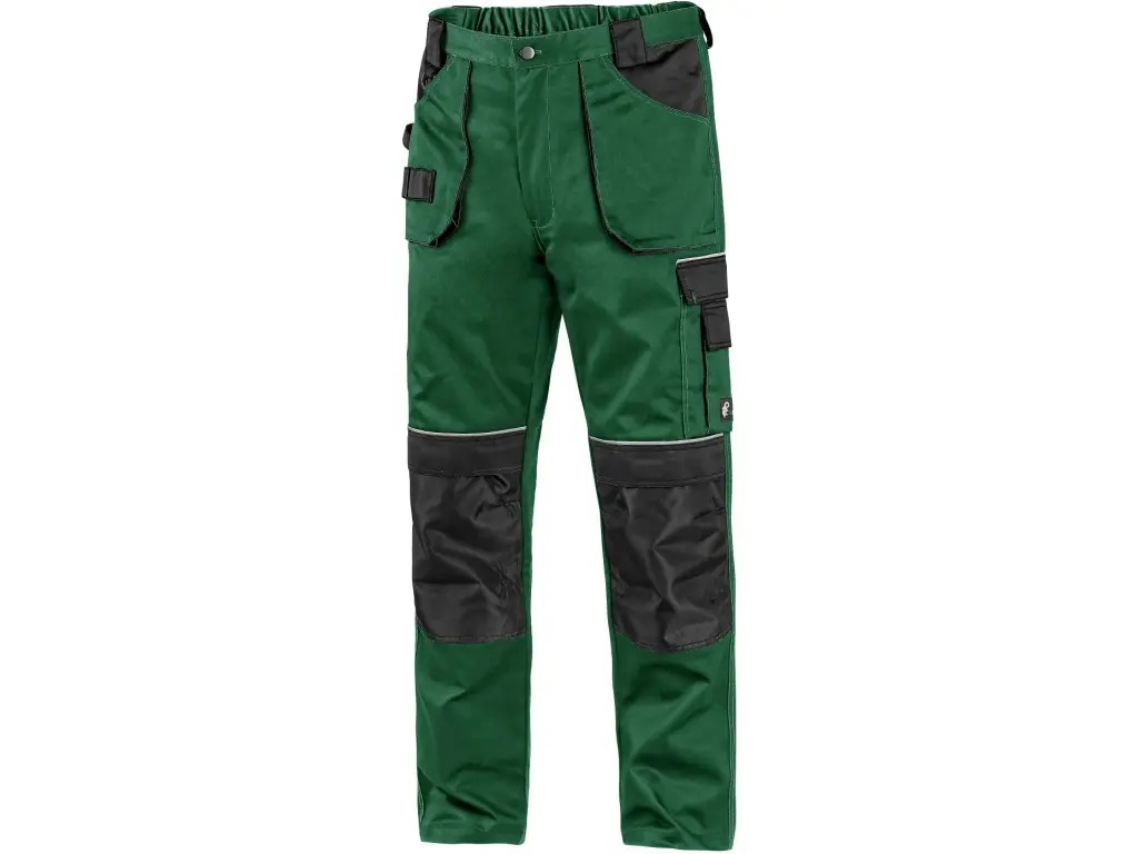 Pánské montérkové kalhoty, pas s poutky na opasek, vzadu do gumy, přední kapsy s poutky na nářadí, multifunkční kapsy na obou stranách, kolena zesílena 600D polyesterem s možností vložení kolenních výztuh, dvě zadní kapsy, jedna na suchý zip, reflexní doplňky.