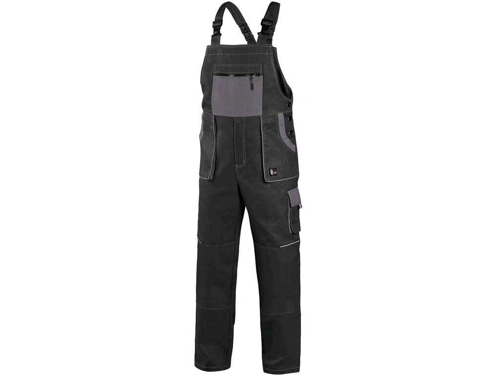 Pánske montérkové nohavice s náprsenkou, náprsné vrecko na zips, pás vzadu do gumy, predné vrecká, bočné vrecko na zvinovací / skladací meter, bočné vrecko na mobil / peňaženku, zdvojené kolená, zadné vrecko s chlopňou, traky s gumou vzadu, reflexné doplnky.