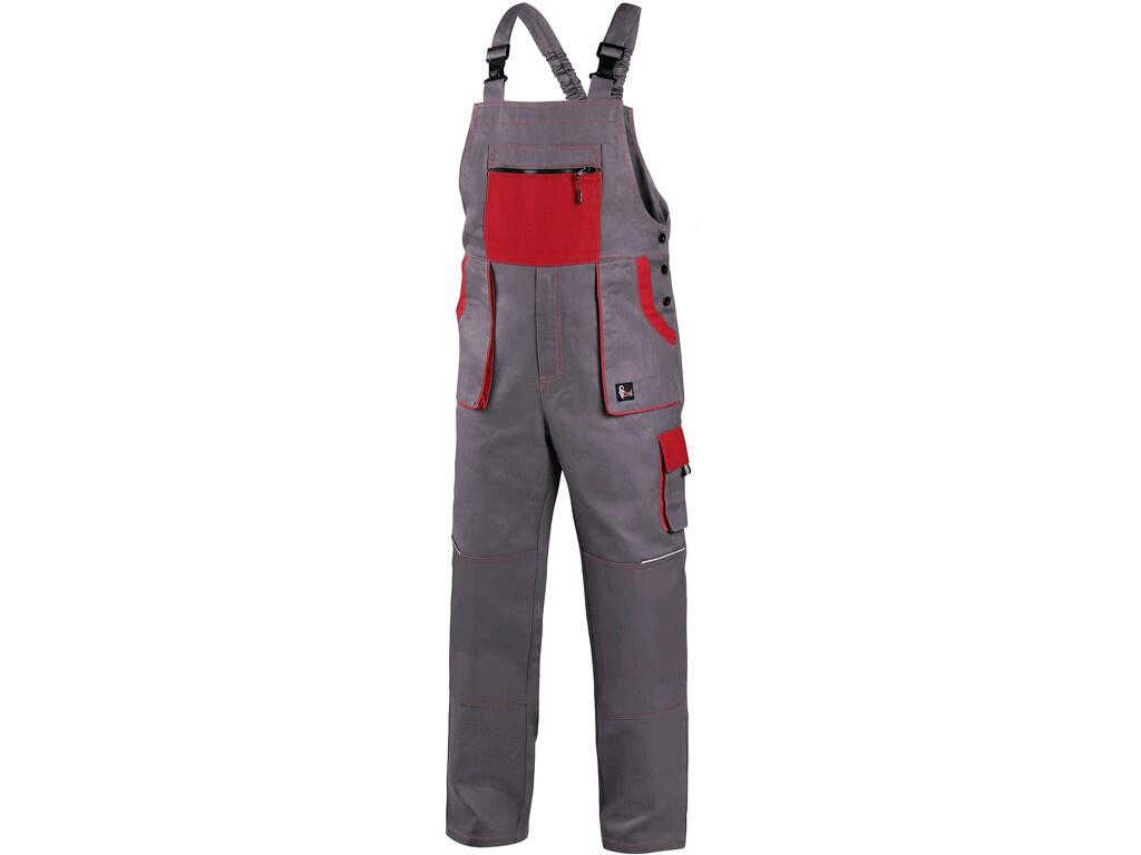 Pánske montérkové nohavice s náprsenkou, náprsné vrecko na zips, pás vzadu do gumy, predné vrecká, bočné vrecko na zvinovací / skladací meter, bočné vrecko na mobil / peňaženku, zdvojené kolená, zadné vrecko s chlopňou, traky s gumou vzadu, reflexné doplnky.