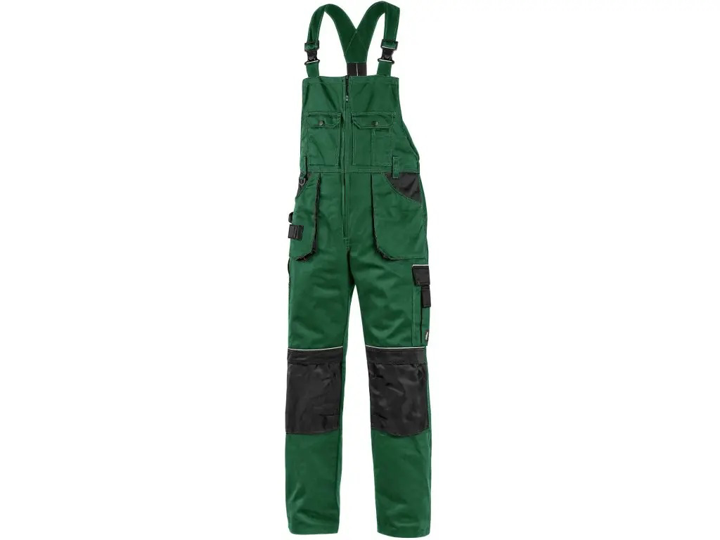 Pánské montérkové kalhoty s náprsenkou, náprsní kapsy s klopami, pas s poutky na opasek, vzadu do gumy, přední kapsy s poutky na nářadí, multifunkční kapsy na obou stranách, kolena zesílena 600D polyesterem s možností vložení kolenních výztuh, dvě zadní kapsy, jedna na suchý zip, šle s gumou vzadu, reflexní doplňky.