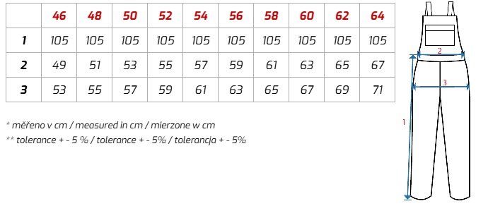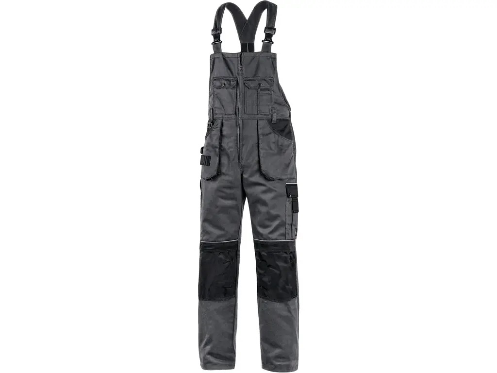 Pánské montérkové kalhoty s náprsenkou - zkrácená varianta na výšku 170-176 cm. Náprsní kapsy s klopami, pas s poutky na opasek, vzadu do gumy, přední kapsy s poutky na nářadí, multifunkční kapsy na obou stranách, kolena zesílena 600D polyesterem s možností vložení kolenních výztuh, dvě zadní kapsy, jedna na suchý zip, šle s gumou vzadu, reflexní doplňky.