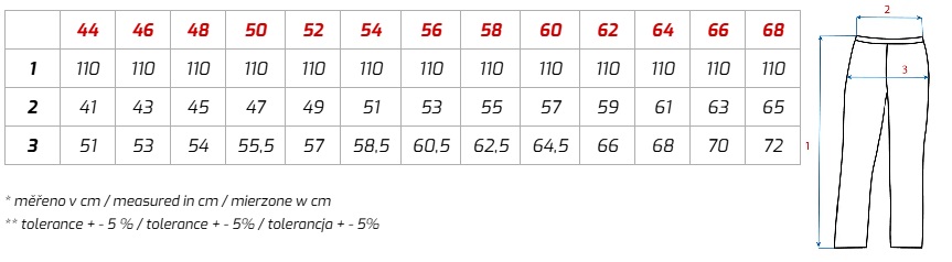 Pánské montérkové kalhoty, pas s poutky na opasek a gumou v bocích, přední klínové kapsy, multifunkční kapsy na obou stranách, kolena zesílena materiálem 600D polyesterem s možností vložení kolenních výztuh, dvě zadní kapsy s klopami, reflexní doplňky.