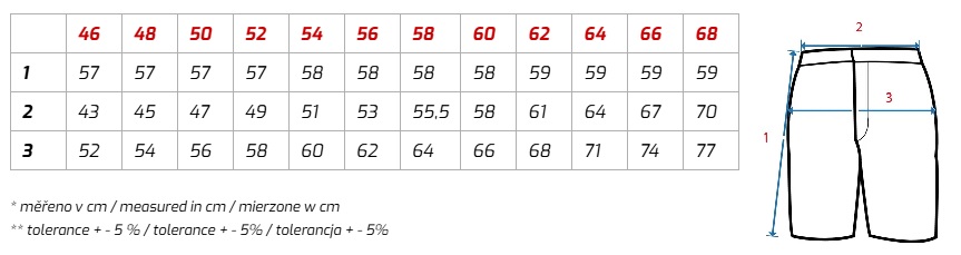 Pánské montérkové kraťasy, pas s poutky na opasek, vzadu do gumy, přední kapsy s poutky na nářadí, multifunkční kapsy na obou stranách, dvě zadní kapsy, jedna na suchý zip, reflexní doplňky.