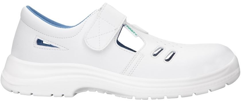 Popis: bílý sandál se svrškem z pratelného mikrovlákna vzhledu kůže s ocelovou špicí, uvnitř prodyšná textilie zajišťující absorpci vlhkosti, podešev vyrobená z polyuretanu, vhodné do zdravotnictví a potravinářského průmyslu.