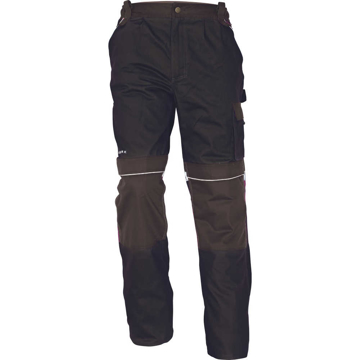 pracovní kalhoty vysoké odolnosti, elastický pas; kovové zipy a druky zapínání; 5 fukčních kapes; zesílená kolena s kapsami na vkládání nákoleníků; reflexní doplňky.