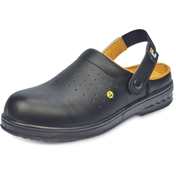 Bezpečnostní ESD sandály s páskem přes patu ze syntetického materiálu s vysokými mikroporézními vlastnostmi, svrškem z mikrovlákna, kompozitní tužinkou. PU podrážkou rezistentní olejům a s lepšími protiskluzovými parametry.