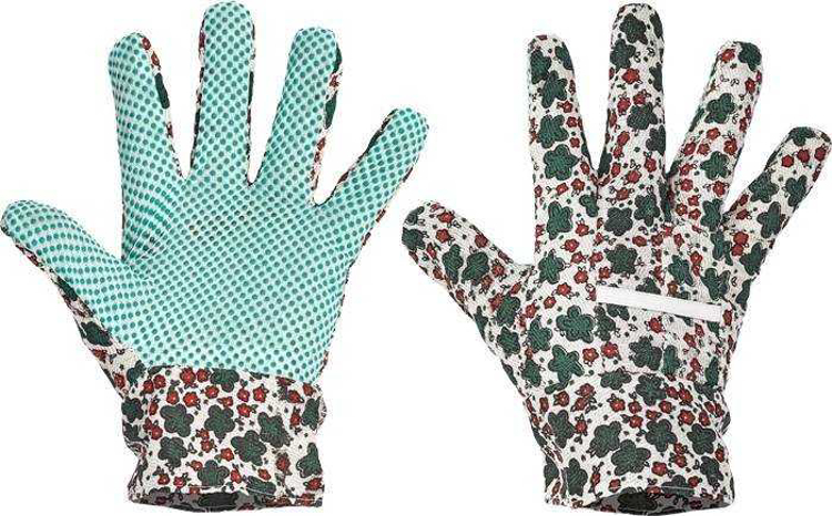Popis: Rukavice šité z barevné bavlněné tkaniny, s PVC terčíky v dlani a na prstech.
