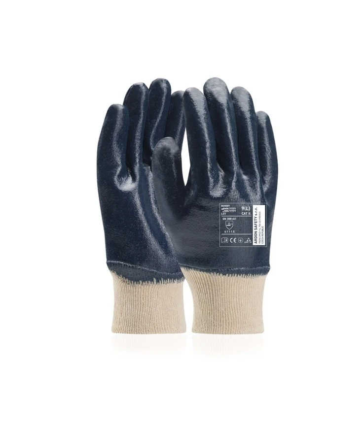 Rukavice polomáčené v modrém nitrilu s úpletovou manžetou.