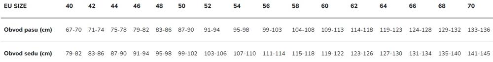 Tabulky velikostí ochranných pracovních oděvů, obuvi a rukavic.