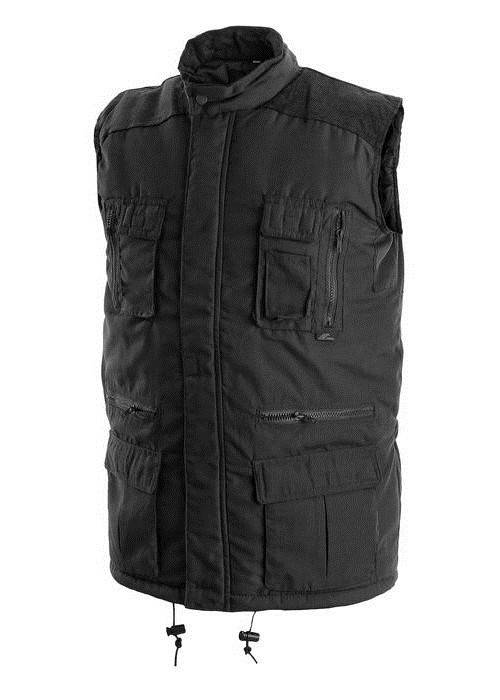 Popis: zateplená vesta, ramena a límec pošitý manšestrem, pružné stažení průramku, možnost stažení vesty v pase, 14 kapes - z toho 3 kapsy uvnitř vesty.