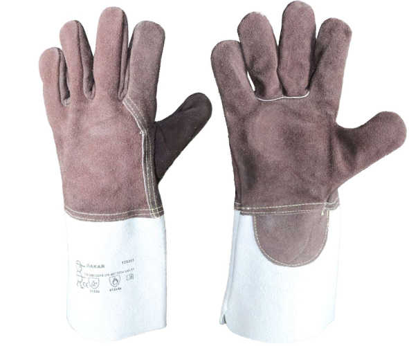 Celokožené rukavice z lícové hověziny v dlani, hovězí štípenky na hřbetu, s tuhou 15 cm širokou manžetou, bez podšívky. Certifikát: svářečské práce - typ B
