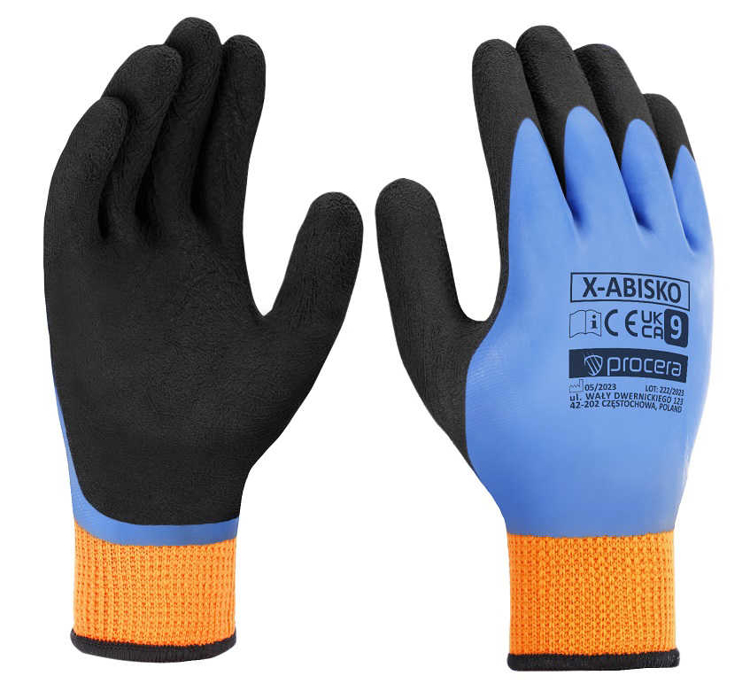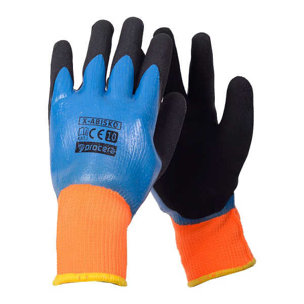 Popis: Rukavice X-ABISKO ze zatepleného polyesterovo-bavlněného úpletu v oranžové barvě, dvojitě potažené vrstvou hladkého latexu a latexové pěny v dlaňové části a celých prstech v hřbetní části. Ideální pro práci při nízkých teplotách i ve vlhkém prostředí. Velmi dobrá přilnavost. Vysoká odolnost proti oděru. Ukončeno lemem.
