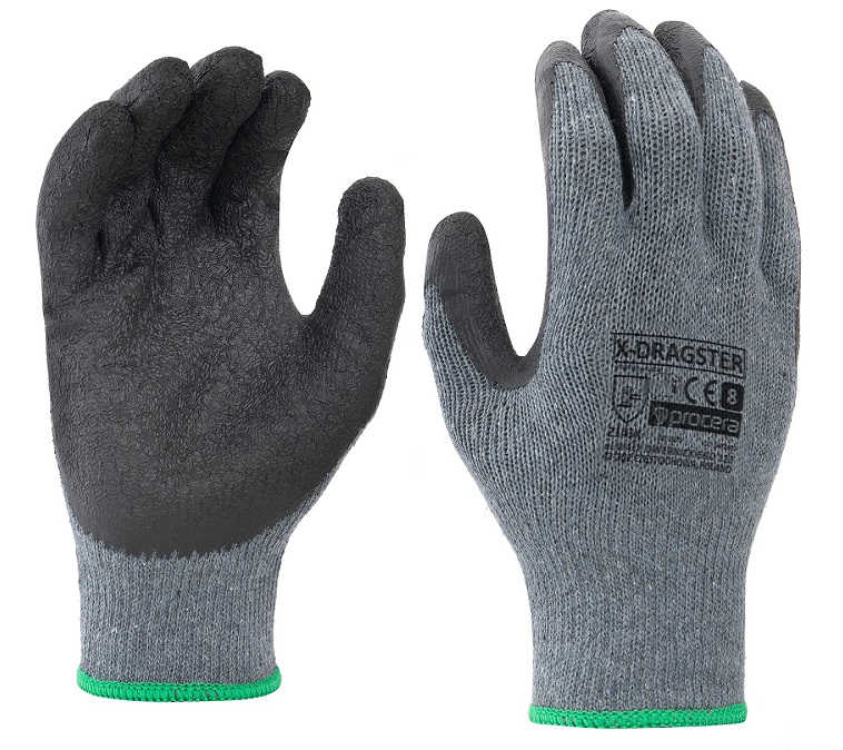 Rukavice X-DRAGSTER z šedé polyesterové pletené bavlny, potažené v úchopové části latexem se zdrsněnou strukturou. Velmi dobrá přilnavost. Ukončeno lemem