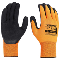 Rukavice X-FOMER z oranžového polyesterového úpletu, v oblasti úchopu potažené latexovou pěnou s hrubou strukturou.