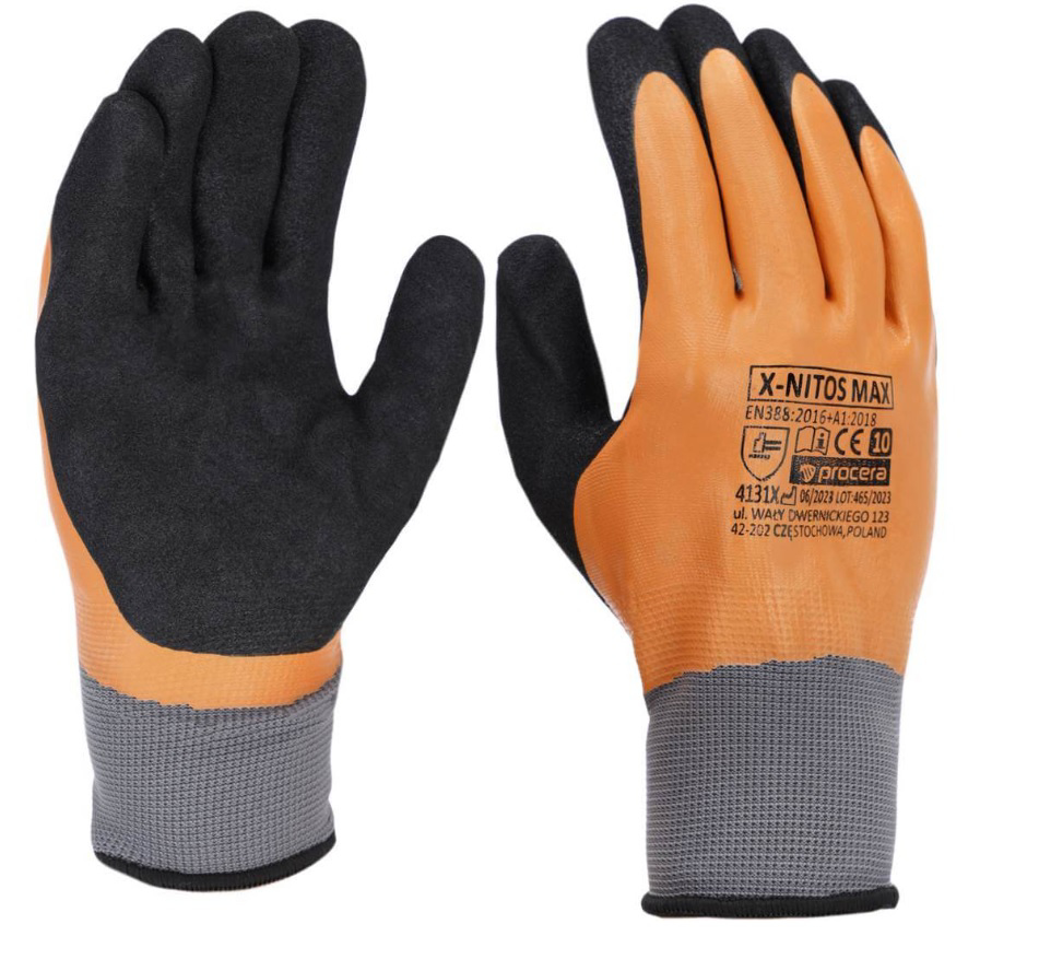 Popis: Rukavice X-NITOS MAX jsou vyrobeny z 15g polyesteru s dvojitou vrstvou: celá rukavice je potažena hladkým nitrilem NBR a oblast úchopu je navíc potažena nitrilem „SANDY“. Ideální pro ruční práci. Zvýšená odolnost vůči kapalinám, olejům a tukům. Pružné a pružné, dobře se přizpůsobí tvaru ruky. Zdrsněná struktura povlaku zajišťuje vynikající úchop. Manžety s manžetami. CE EN 388 (4131X).