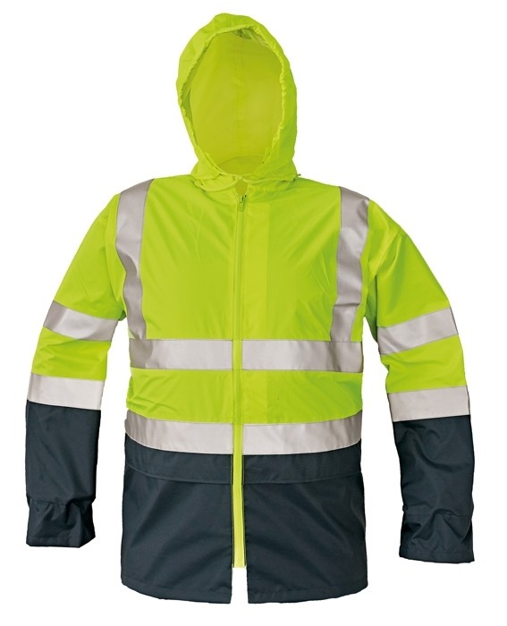 Popis: Hi-Vis bunda bez podšívky • podlepené švy • voděodolnost tř. 3 dle normy EN 343 a paropropustnost tř. 1 dle normy EN 343 • reflexní pásky 3M • kapuce v límci • spodní lem bundy stažitelný na tkaničku