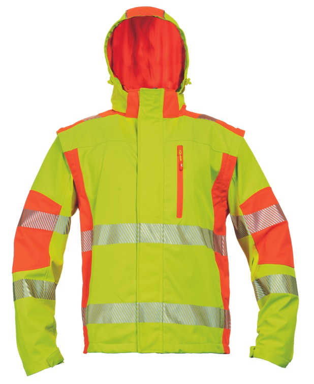 Popis:kvalitní pánská prodyšná softshellová bunda s odepínatelnými rukávy a kapucí; dvoubarevné HI-VIS provedení; segmentované tištěné reflexními pruhy okolo boků a rukávů; větru a vodě odolný materiál s TPU membránou; 2 postranní kapsy na zip, náprsní kapsa na zip, 2 vnitřní kapsy; nastavitelná šíře spodního obvodu bundy pomocí stahovací šňůrky; nastavitelná šíře rukávů pomocí suchého zipu.Materiál:Vnitřní vrstva: 100 % polyesterSvrchní materiál: 100 % polyester, 270 g/m², Povrstvení: TPUNormy:EN ISO 13688 EN ISO 20471 (Class: 3)Vlastnosti:Vlastnosti oděvů: Odepínatelné rukávy, Voděodolné oděvy, Prodyšné oděvyPočet pracích cyklů: 25Vodní sloupec: 8000 mmParopropustnost: 500 g/m2/24hÚdržba:Perte zvlášť šetrně na 40 °CNebělte. Nesmí se bělit peroxidovými ani chlorovými přípravkyNesušte v sušičceNežehlete. Při žehlení hrozí nevratné poškozeníChemické čištění zakázánoUvedená cena za 1ksZáruka: 24 měsíců