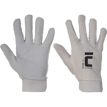 Šité rukavice z jemné kozinky v dlani a bavlněného úpletu na hřbetu ruky. Konce prstů překryté kůží. Pružná manžeta na suchý zip.