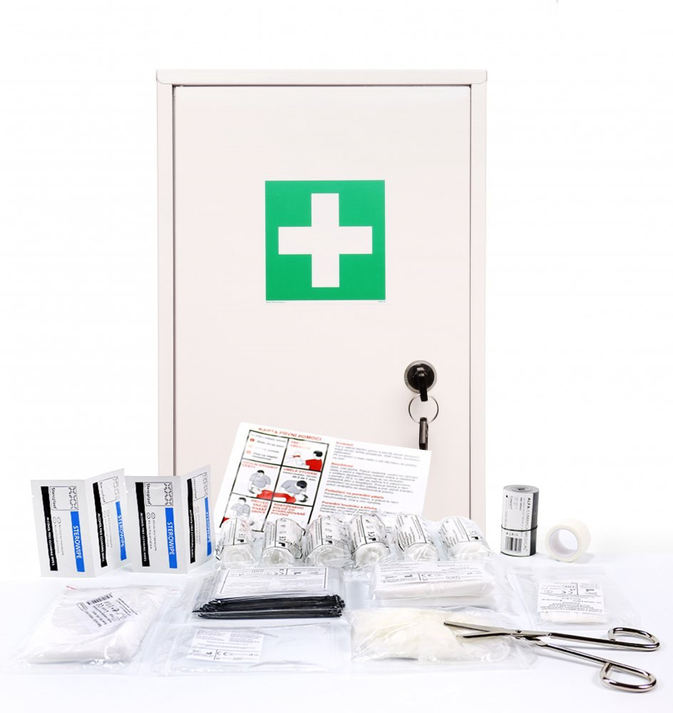 Materiál - pozinkovaný plech, kvalitní polyuretanový lak a pevná konstrukce s poličkami zajišťuje dlouhodobou životnost. Symbol zdravotnického kříže je součástí balení. Velký vnitřní prostor umožňuje umístit kteroukoli z našich výbav. Pokud uvažujete o lékárničce do výrobních prostor, pak je tato lékárnička nejlepší volbou. Vydrží i velmi nešetrné zacházení a je uzamykateľná. Šrouby k připevnění lékárničky ke stěně jsou součástí balení. Základní výbava je vhodná jako firemní lékárnička pro všechny typy firem a činností, které nemají významná zvláštní rizika úrazů. Například administrativa, služby, obchody, sklady, jednoduchá výroba. Pokud ale Vaše podnikání patří do některé z následujících odvětví: školy, kuchyně, hotely, restaurace, chemické provozy, laboratoře, mehanizované sklady, kovovýroba s použitím strojů a el. nářadí, stavebnictví, stolárny a dřevovýroba, pracoviště s otevřeným ohněm, sportování nebo koupaliště a bazény je potřeba vybrat lékárničky s vybavením podle rizik nebo samostatné výbavy které naleznete níže.