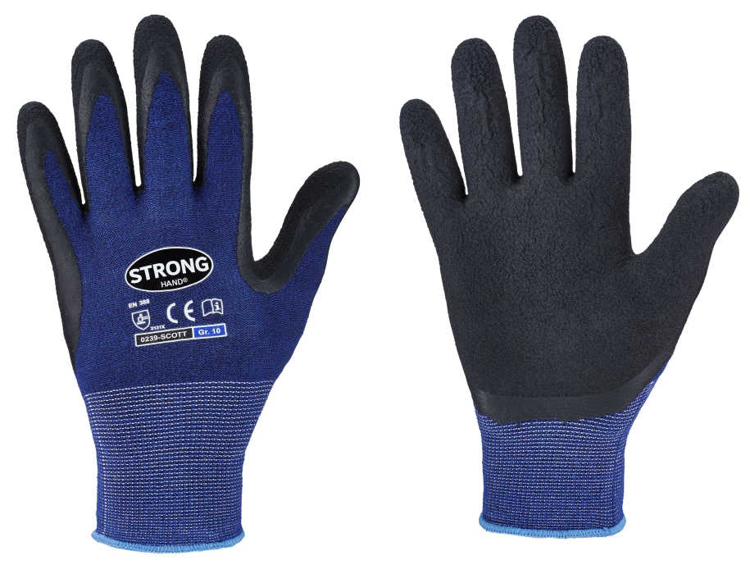 Bezešvé pletené rukavice ze syntetické příze s nánosem latexu na dlani a prstech. Pružná manžeta.