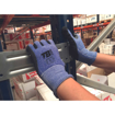 modré bezešvé rukavice z HDPC, skleněného vlákna a nylonu máčené v mikroporézním nitrilu na dlani a prstech • zesílení mezi ukazovákem a palcem • neobsahují silikon • pratelné • pletená manžeta • hustota úpletu 13 GG