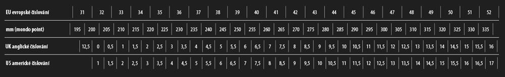 • MM: Metrický systém (mondopoint) udává délku chodidla v milimetrech