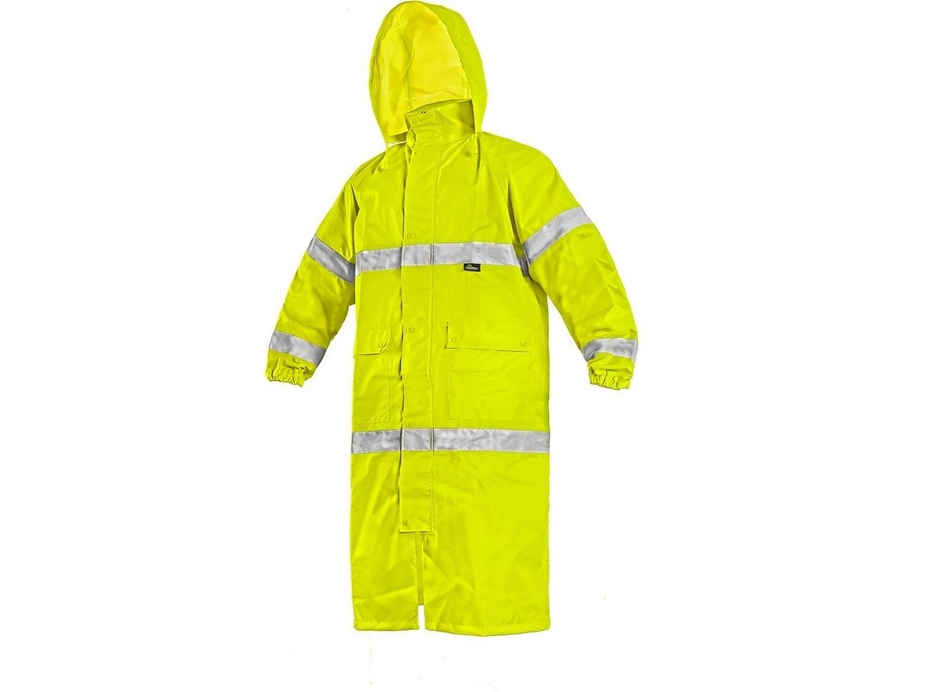 Popis: výstražný plášť s reflexními pruhy, nepromokavý, lepené švy, odepínací kapuce v límci, zapínání na zip krytý légou, raglánové rukávy v manžetě do gumy, dvě spodní kapsy s patkou, větrání na zádech. Plášť je složen v praktickém balení na zip. Délka pláště 120 cm.